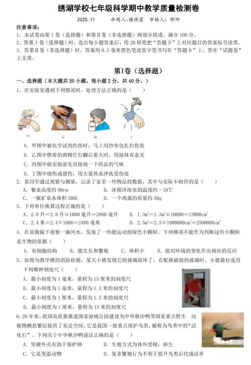 浙江省金华市义乌市绣湖中学七年级科学期中教学质量检测卷 2025.11(扫描PDF版,无答案 1-2章)