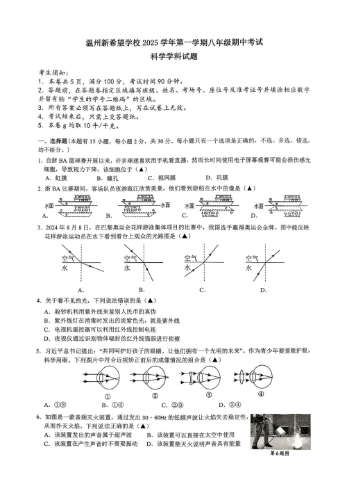 温州2025学年第一学期新希望联盟八年级科学期中试卷(扫描附答案)