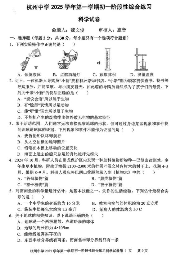 浙江省杭州市上城区杭州中学2025-2026学年七年级上学期11月期中科学试题(1-3.2章 无答案 扫描PDF版)
