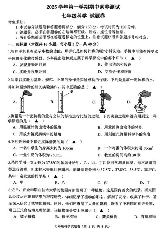 浙江省湖州市长兴县2025-2026学年七年级上学期11月期中科学试题(扫描版,含答案)