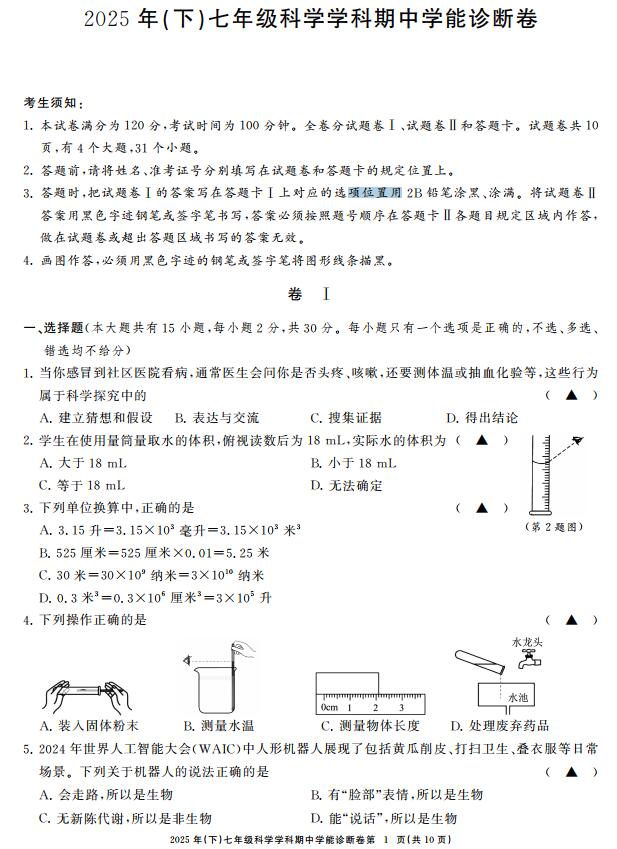 1 . 当你感冒到社区医院看病, 通常医生会问你是否头疼、 咳嗽, 还要测体温或抽血化验等, 这些行为 属于科学探究中的 ( ▲ ) A. 建立猜想和假设 B. 表达与交流 C. 搜集证据 D. 得出结论 (第2 题图) 2. 学生在使用量筒量取水的体积, 俯视读数后为18 mL, 实际水的体积为 ( ▲ ) A. 大于18 mL B. 小于18 mL C. 等于18 mL D. 无法确定 3 . 下列单位换算中, 正确的是 ( ▲ ) A. 3 .15 升=3 .15 ×103 毫升=3 .15 ×103 米3 B. 525 厘米=525 厘米×0.01 =5 .25 米 C. 30 米=30×109 纳米=3 ×1010 纳米 D. 0.3 米3 =0.3 ×106 厘米3 =3 ×105 升 4. 下列操作正确的是 ( ▲ ) A. 装入固体粉末 B. 测量水温 C. 测量物体长度 D. 处理废弃药品 5 . 2024 年世界人工智能大会( WAIC) 中人形机器人展现了包括黄瓜削皮、 打扫卫生、 叠衣服等日常 场景。 下列关于机器人的说法正确的是 ( ▲ ) A. 会走路, 所以是生物 B. 有“脸部”表情, 所以是生物 C. 无新陈代谢, 所以是非生物 D. 能“说话”, 所以是生物