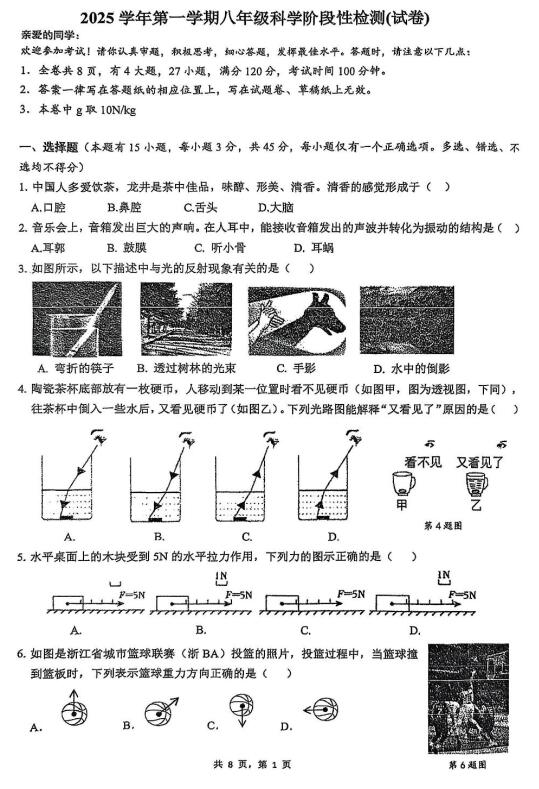 浙江省温州市温州实验中学2025学年第一学期八年级科学阶段性检测(试卷)(扫描PDF版,无答案 1-2章)