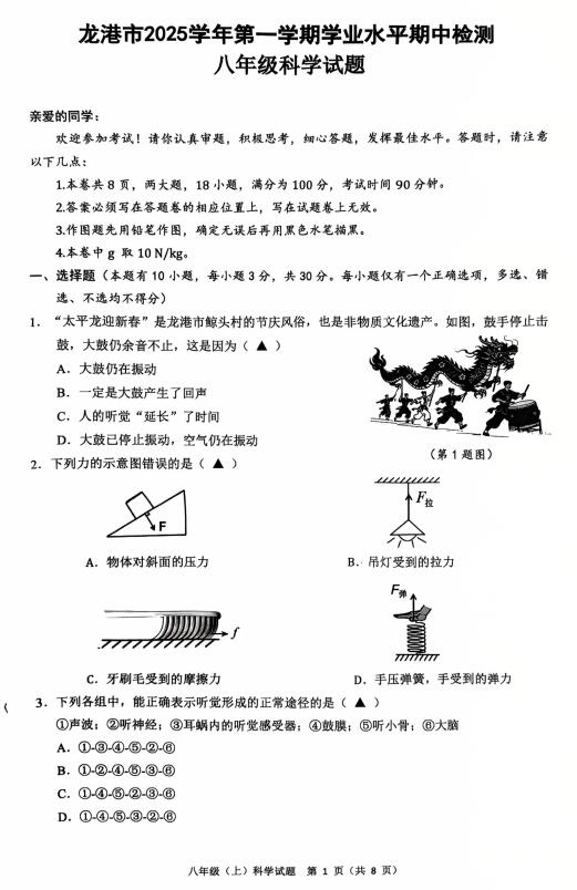 浙江省温州市龙港市2025学年第一学期学业水平期中检测 八年级科学试题(扫描PDF版,无答案 1-2章)
