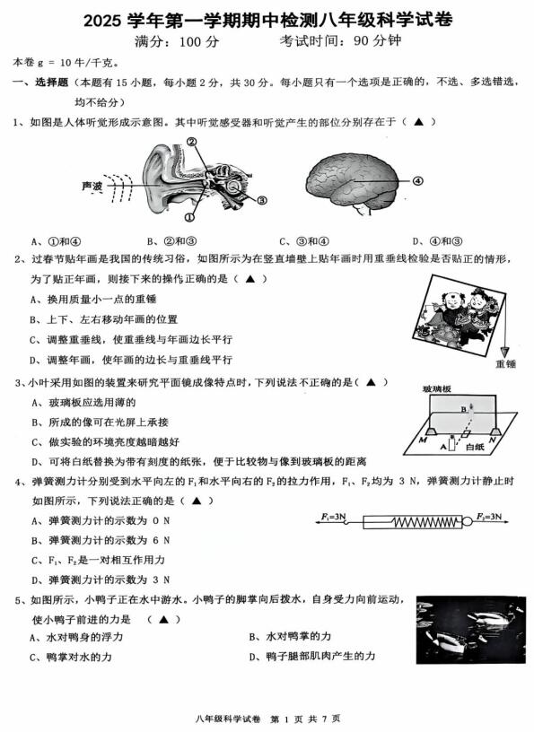 浙江省温州第十七中学2025学年第一学期期中检测八年级科学试卷(扫描PDF版,无答案 1-2章)