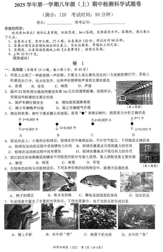 浙江省温州市第二中学2025学年第一学期八年级(上)期中检测科学试题卷(扫描PDF版,无答案 1-2章)