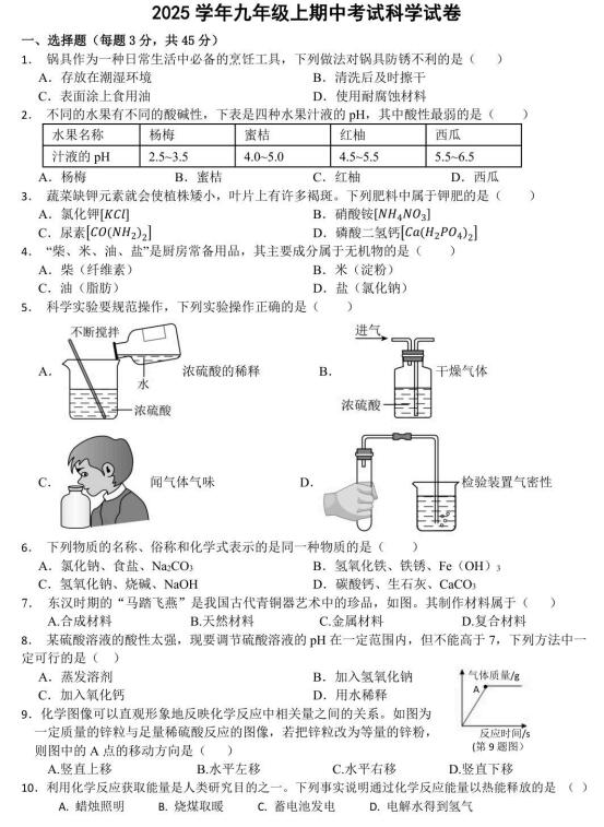 浙江省绍兴市诸暨市实验初级中学2025学年九年级上期中考试科学试卷(扫描PDF版,无答案+答题卷 1.1-3.2)