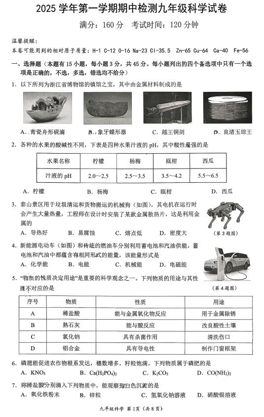 浙江省温州市绣山中学2025学年第一学期期中检测九年级科学试卷(扫描PDF版,无答案 1.1-3.2)