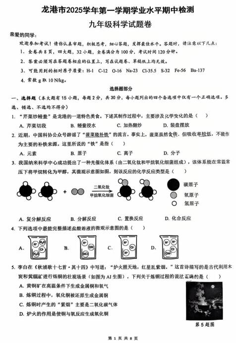 浙江省温州市龙港市2025学年第一学期学业水平期中检测 九年级科学试题卷(扫描PDF版,无答案 1.1-3.3)