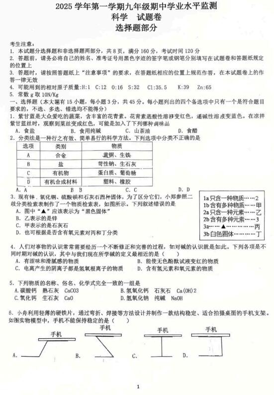 浙江省舟山市定海区舟山南海教育集团(南海实验学校)2025学年第一学期九年级期中学业水平监测 科学试题卷(扫描PDF版,无答案 1.1-3.4)