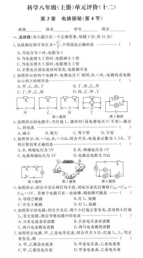 八上周周清第三章电路探秘(第4节)(扫描附答案)
