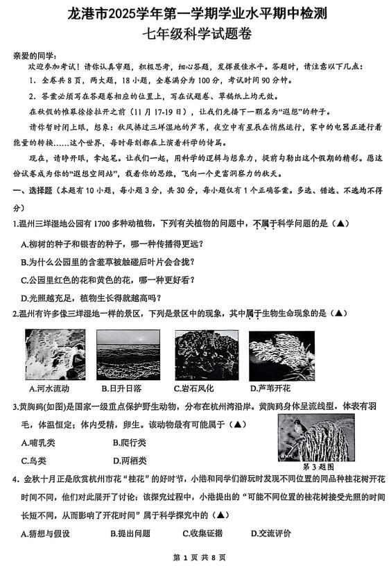 浙江省温州市龙港市2025-2026学年11月七年级上册期中检测科学试题卷(扫描附答案)