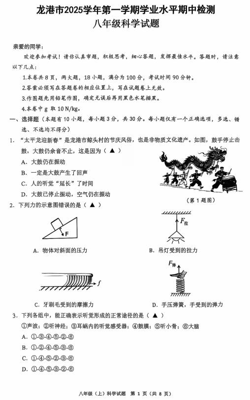 浙江省温州市龙港市2025-2026学年11月八年级上册期中检测科学试题卷(扫扫描附答案)