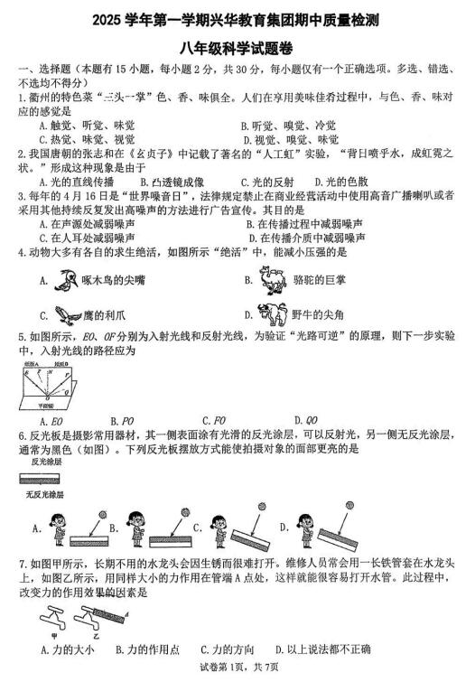 浙江省衢州市2025学年第一学期兴华教育集团期中质量检测八年级科学试卷(扫描pdf版,无答案第1-2章)