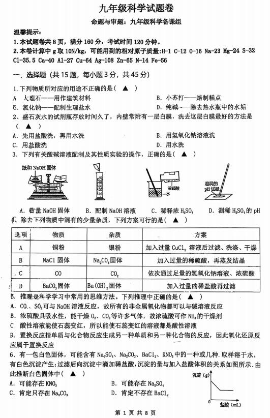 浙江省杭州市滨江区2025学年第一学期六校联考九年级科学期中试卷(扫描PDF版,无答案 1.1-3.4)