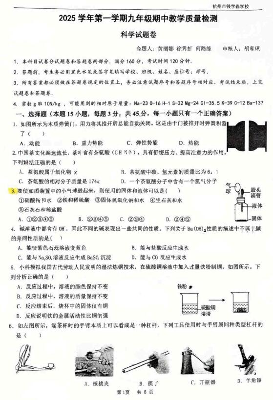 浙江省杭州市钱学森学校2025学年第一学期九年级期中教学质量检测 科学试题卷(扫描PDF版,无答案 1.1-3.4)
