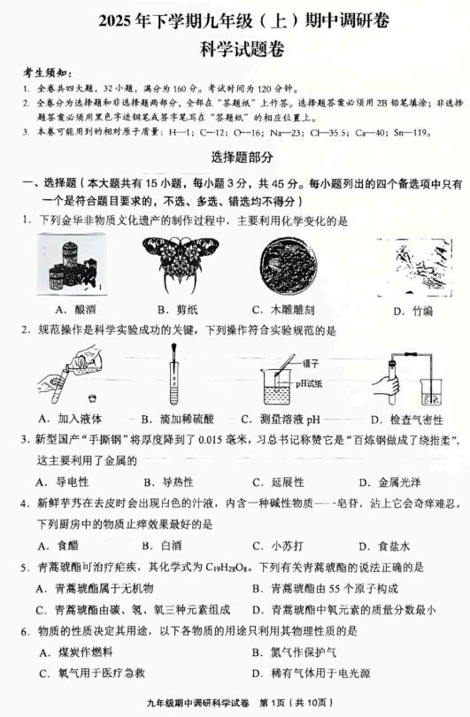 浙江省金华市东阳市2025年下学期九年级(上)期中调研卷 科学试题卷(扫描PDF版,无答案 1-2章)