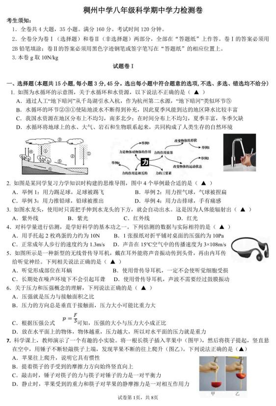 浙江省金华市义乌市稠州中学2025-2026学年八年级上学期11月期中科学试题(扫描pdf版,含答案1-2章)