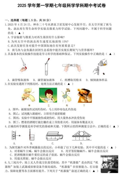 浙江省金华市义乌市丹溪中学2025学年第一学期七年级科学学科期中考试卷(扫描PDF版,含答案+答题卷 1-2章)