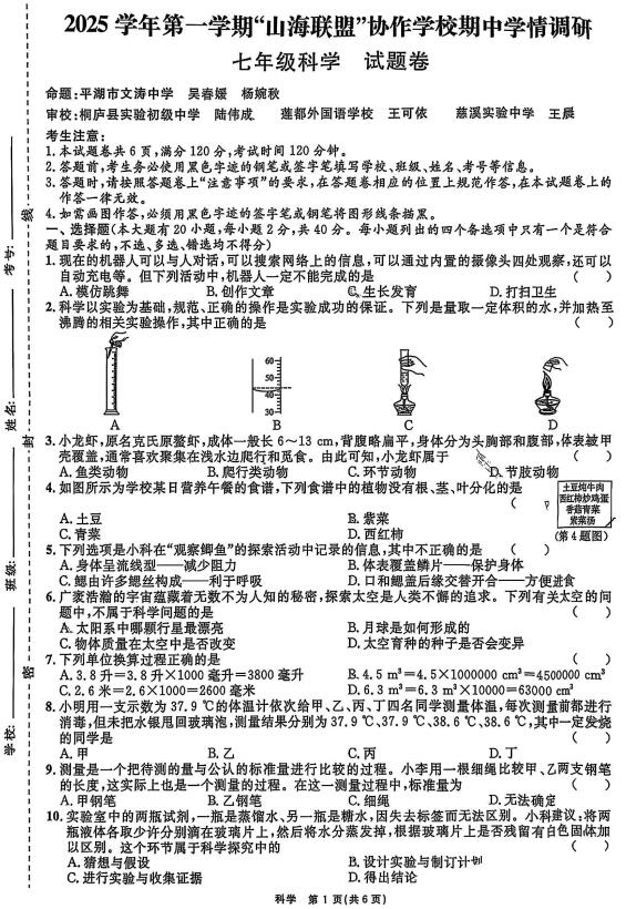 浙江省2025学年第一学期“山海联盟”协作学校期中学情调研 七年级科学试题卷(扫描PDF版,含答案 1-2章)