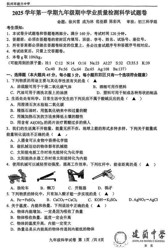 浙江省杭州市建兰中学 2025学年第一学期九年级期中学业质量检测科学试题卷(扫描PDF版,无答案 1.1-3.4)