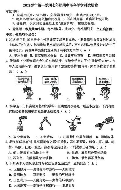浙江省宁波市余姚市城区学校2025学年第一学期七年级期中考科学学科试题卷(扫描PDF版,含答案 1.1-3.1)