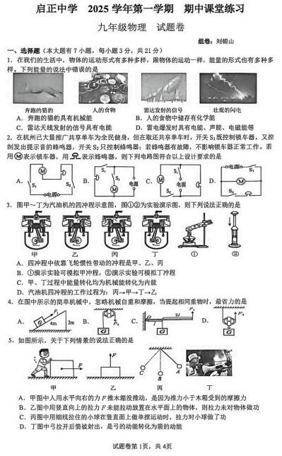 浙江省杭州市启正中学2025-2026学年九年级上学期科学期中试题(扫描pdf版,无答案,物理部分)