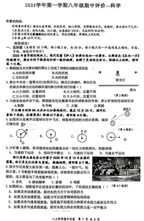 浙江省温州市瑞安五校(滨江毓蒙安高瑞祥等)联考2025学年第一学期八年级期中评价-科学(扫描PDF版,无答案 1-2章)