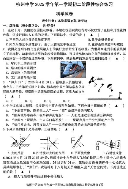 浙江省杭州市杭州中学2025-2026学年11月八年级上册科学期中综合测试卷(扫描无答案)