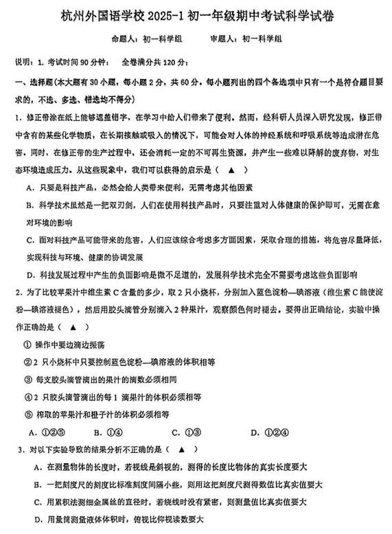 浙江省杭州市杭州外国语学校2025-2026学年七年级上学期期中科学试卷(扫描pdf版,无答案1-3章)