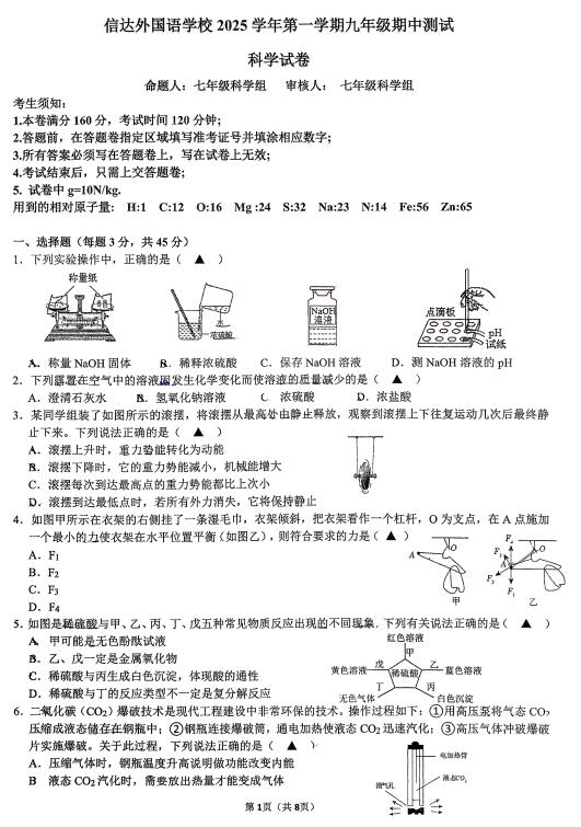 浙江省杭州市临平区信达外国语学校2025学年第一学期九年级期中测试 科学试卷(扫描PDF版,无答案 1-3章)