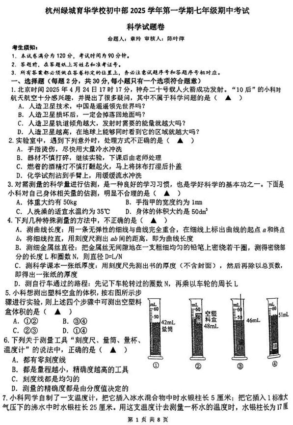 浙江省杭州市绿城育华学校初中部2025学年第一学期七年级期中考试 科学试题卷(扫描PDF版,无答案 1-2章)