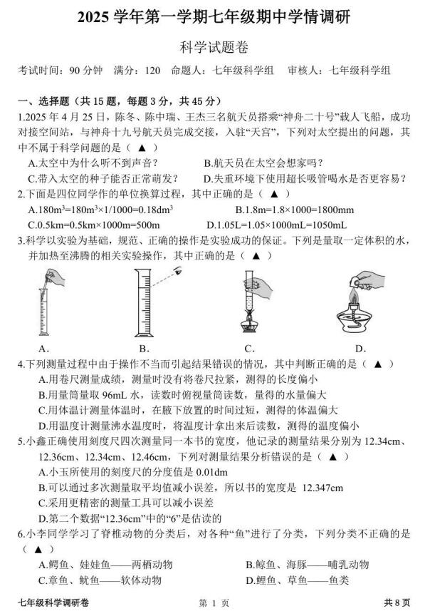浙江省杭州市萧山区钱江东片2025学年第一学期七年级期中学情调研 科学试题卷(扫描PDF版,含答案 1-2章)