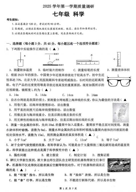浙江省杭州市保俶塔实验学校2025学年第一学期质量调研 七年级科学(扫描PDF版,无答案 1-3章)
