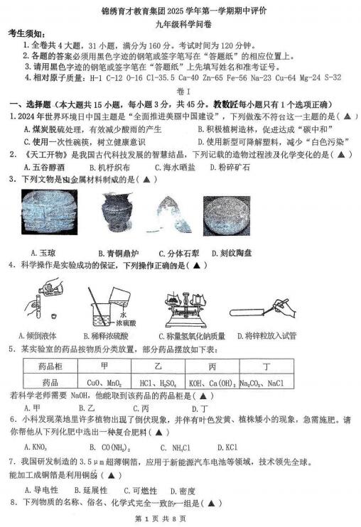 浙江省衢州市衢江区锦绣育才教育集团2025学年第一学期期中评价 九年级科学问卷(扫描PDF版,无答案 1.1-3.3)
