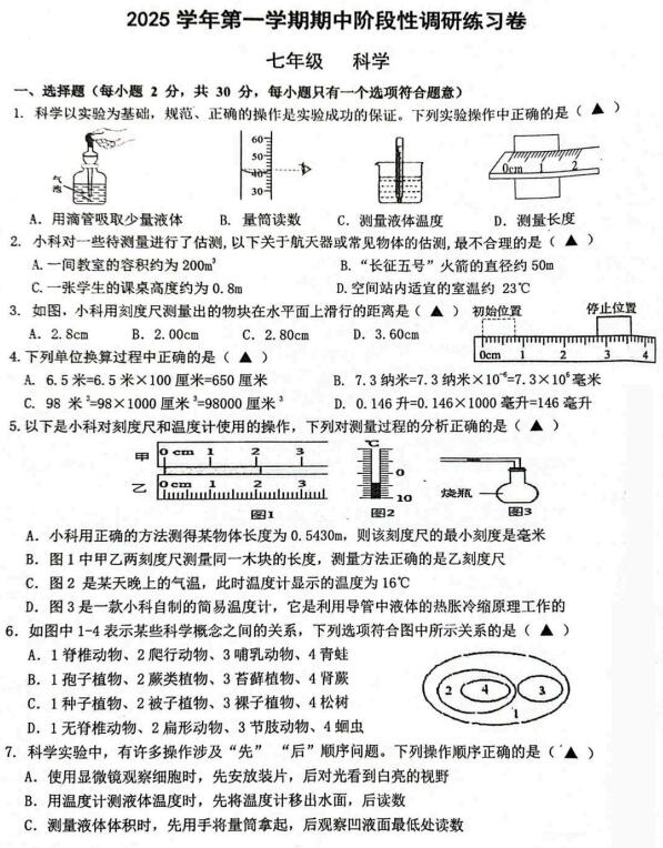浙江省杭州市杭州第十四中学附属学校2025学年第一学期期中阶段性调研练习卷 七年级科学(扫描PDF版,无答案 1.1-4.1)