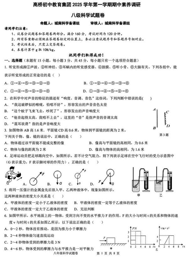浙江省杭州市萧山区高桥初中教育集团2025-2026学年八年级上学期科学期中试卷(扫描pdf版,含答案1-2章)