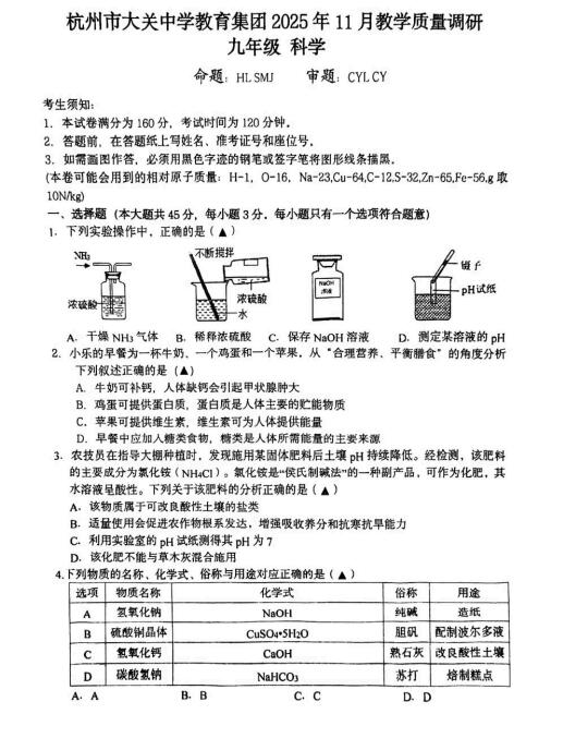 浙江省杭州市大关中学教育集团2025年11月教学质量调研 九年级科学(扫描PDF版,无答案 1.1-3.4+4.1-4.2)