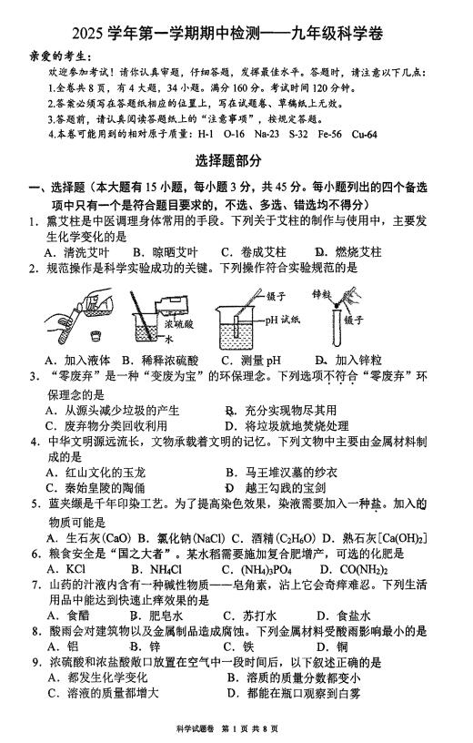浙江省台州市玉环市2025-2026学年第一学期期中检测九年级科学试卷(扫描,含答案)
