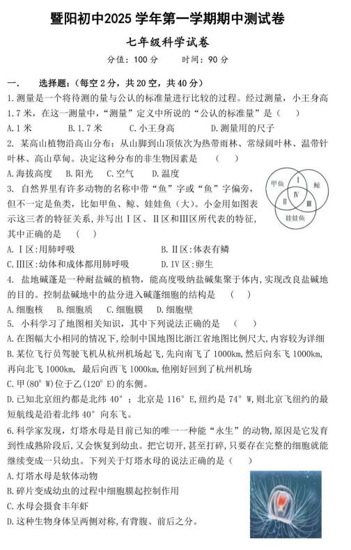 浙江省绍兴市诸暨市暨阳初级中学2025学年第一学期期中测试卷 七年级科学试卷(扫描PDF版,含答案 1.1-3.1)
