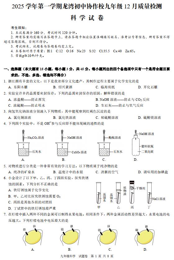 1. 浙江拥有丰富的文化,以下是我省部分文化遗产,其制作过程主要属于化学变化的是 A. 东阳木雕 B. 绍兴黄酒 C. 临海剪纸 D. 开化石雕 2. 实验室许多药品需要密封保存。下列药品需密封保存的原因,解释错误的是 A. 浓盐酸——防止挥发 B. NaOH 溶液——防止与 CO2 反应 C. 浓硫酸——防止吸水 D. 生石灰——防止与氧气反应 3. 向氢氧化钠溶液分别滴入下列物质,其中能观察到红褐色沉淀的是 A. 氯化铜溶液 B. 氯化铁溶液 C. 稀硫酸溶液 D. 硫酸镁溶液 4. 下列四个实验中,不是 OH—参与反应即不能体现碱的通性的是 5. 对物质进行分类是一种非常有效的学习方法。以下物质属于纯净物的是 A. 纯净的矿泉水 B. 温度计中的水银 C. 清新的空气 D. 调味用的加碘盐 6. 小金设计了以下甲、乙、丙、丁四组实验,探究铁锈 蚀的因素。下列分析不正确的是 A. 铁钉锈蚀属于化学变化 B. 甲、乙对比探究铁锈蚀需要 O2 C. 丙组是其他各组的对照组 D. 丁试管中的铁钉锈蚀最严重 7. 在柠檬中插入两种不同的金属可以制得水果电池。相同条件下,两种金属活动性差异越大,水果电池的电 压越大。下列柠檬电池中电压最大的是