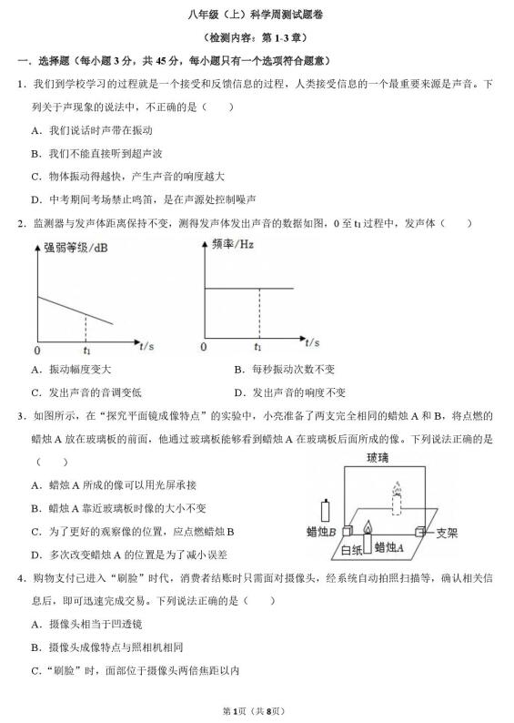浙江省金华市义乌市稠城中学2025学年八年级(上)科学周测试题卷 (检测内容:第1-3章)(扫描PDF版,无答案)