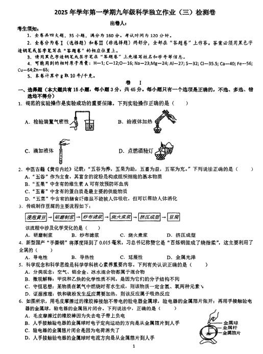 浙江省金华市南苑中学 2025学年九年级上学期12月月考科学试卷(扫描PDF版 无答案 全册)