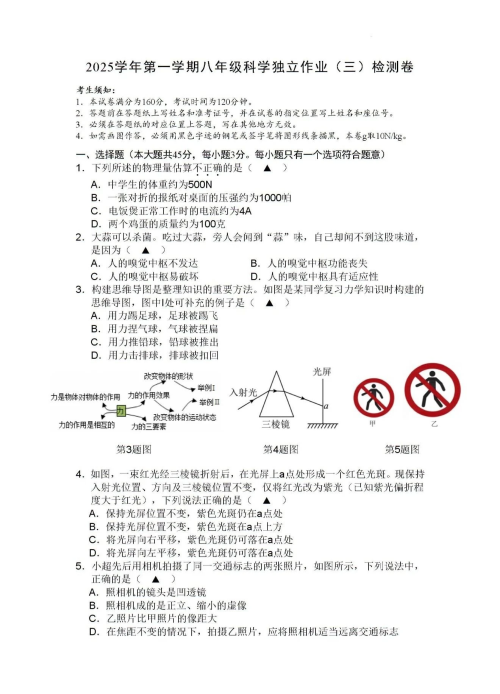 浙江省金华市南苑中学2025学年第一学期八年级上学期第三次科学月考试题(12月月考)(扫描含答案)
