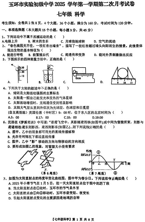 浙江省台州市玉环市实验初级中学2025学年第一学期第二次月考试卷 七年级科学(扫描版,含答案 1-4章)