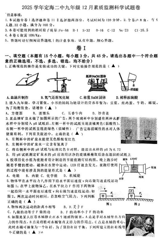 浙江省舟山市定海区2025学年定海二中九年级12月素质监测科学试题卷(扫描PDF版,含答案 全册)