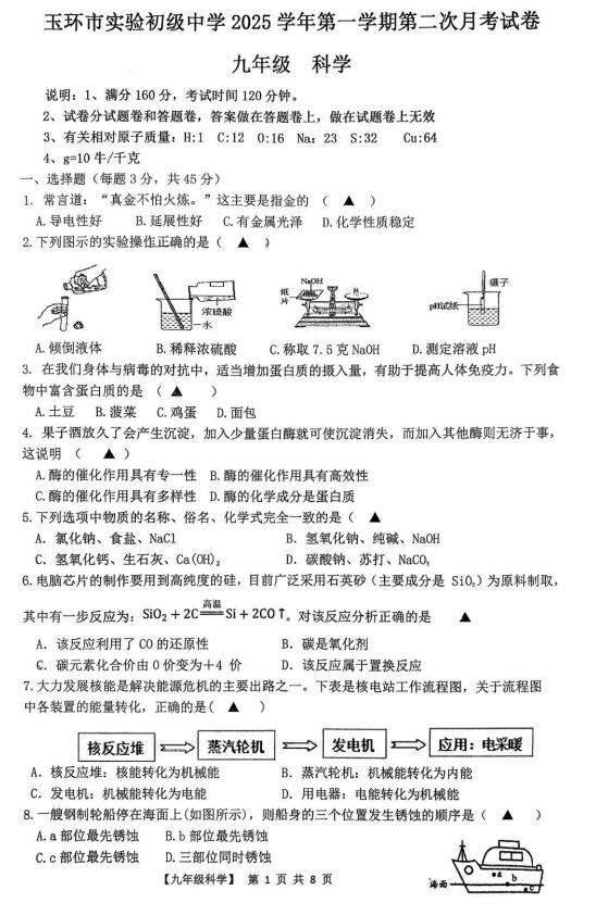 浙江省台州市玉环市实验初级中学2025学年第一学期第二次月考试卷 九年级科学(扫描PDF版,含答案 1.1-4.2)