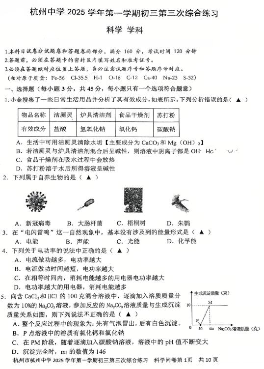 浙江省杭州市杭州中学2025学年第一学期初三第三次综合练习 科学学科(扫描PDF版,无答案 全册)