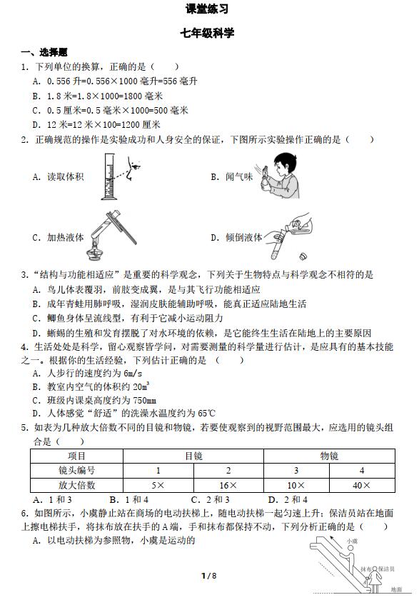 1. 下列单位的换算,正确的是( ) A. 0.556 升=0.556× 1000 毫升=556 毫升 B. 1.8 米=1.8× 1000=1800 毫米 C. 0.5 厘米=0.5 毫米× 1000=500 毫米 D. 12 米=12 米× 100=1200 厘米 2. 正确规范的操作是实验成功和人身安全的保证,下图所示实验操作正确的是( ) A.读取体积 B.闻气味 C.加热液体 D.倾倒液体 3. “结构与功能相适应” 是重要的科学观念,下列关于生物特点与科学观念不相符的是 A.鸟儿体表覆羽,前肢变成翼,是与其飞行功能相适应 B.成年青蛙用肺呼吸,湿润皮肤能辅助呼吸,能真正适应陆地生活 C.鲫鱼身体呈流线型,有利于它减小运动阻力 D.蜥蜴的生殖和发育摆脱了对水环境的依赖,是它能终生生活在陆地上的主要原因 4. 生活处处是科学,留心观察皆学问,对需要测量的科学量进行估计,是应具有的基本技能 之一。根据你的生活经验,下列估计正确的是 ( ) A.人步行的速度约为 6m/s B.教室内空气的体积约 20m3 C.班级内课桌高度约为 750mm D.人体感觉“舒适”的洗澡水温度约为 65℃ 5.如表为几种放大倍数不同的目镜和物镜,若要使观察到的视野范围最大,应选用的镜头组 合是( )