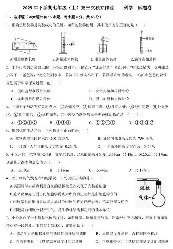 浙江省金华市东阳五校2025年下学期七年级(上)第三次独立作业 科学试题卷(扫描PDF版,含答案+答题卷 1.1-4.1)
