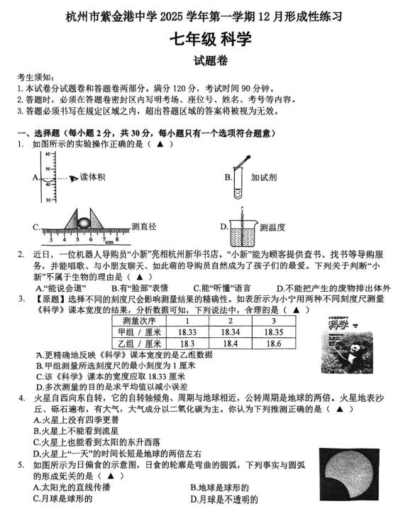 浙江省杭州市紫金港中学2025学年第一学期12月形成性练习 七年级科学试题卷(PDF版,无答案 1-4章)